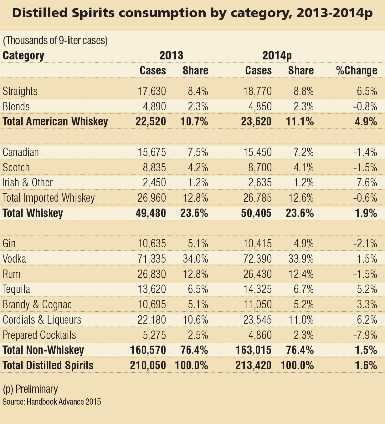 The distilled spirits industry is still struggling to build momentum as it comes out of the recession, growing 1.6 percent in 2014, according to preliminary data from the Beverage Information & Insights Group (BIIG). The research group’s recently released Handbook Advance shows that more than 213.4 million cases of distilled spirits were sold during calendar year 2014, compared to 210.1 million in 2013.