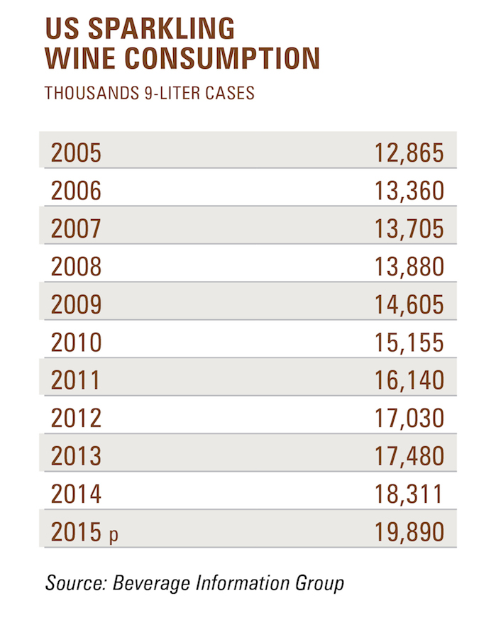 According to the Beverage Information & Insights Group, the research unit of Cheers’ parent company, sales of sparkling wine and Champagne reached a projected 19.9 million nine-liter cases in 2015, up 8.6% over 2014.
