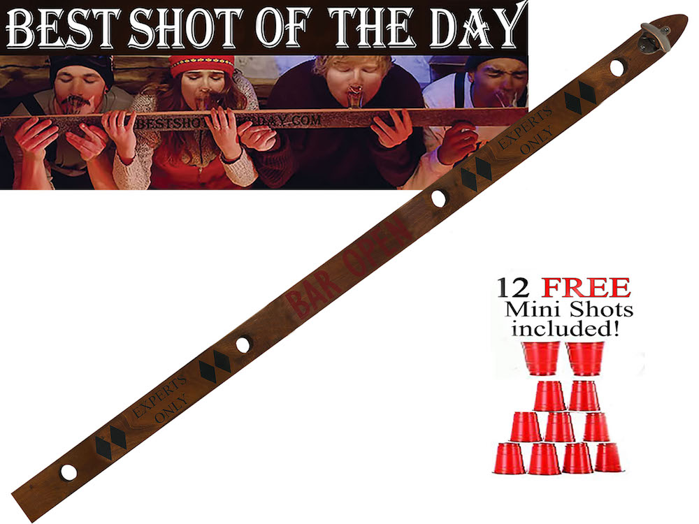 From bestshotoftheday.com, these replica vintage shot-skis are made from poplar wood. Red solo plastic shot cups fit inside the holes along the skis and will not slip while in use. The skis measure 67″ x 3″x.75″. There are no splinters, glass or sharp edges. Full customization is available for brands and bars. Free shipping. The price is $95, or two for $150.