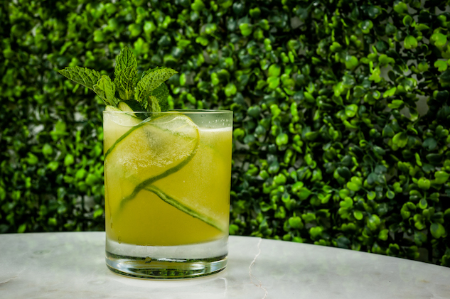 Combine ingredients in a tin with ice and shake. Strain over fresh ice and garnish with fresh mint and cucumber.