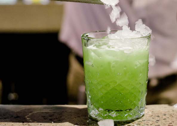 Shake ingredients then strain into a kale-salt-rimmed rocks glass filled with ice. Top with crushed ice. Garnish with 2 dehydrated jalapeno slices kale/citrus powder dust.