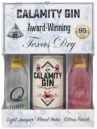 This Calamity Gin gift pack pairs a light juniper, “Texas Dry” gin with mixers to enhance the citrus and floral notes of the spirit.
