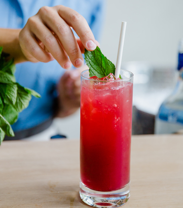 Mix jam, citrus and spirit together in a shaker. Shake, then pour over ice in a glass and top with soda. Garnish with herb.