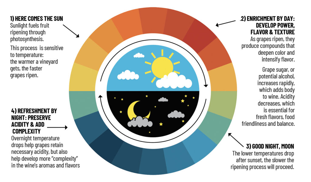All the world’s finest vineyards have something in common: whether they are in a warm or cool climate region, they almost always feature an unusually big drop in temperature from the daytime high to the nighttime low.