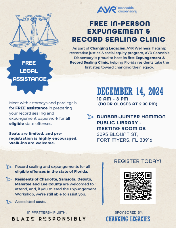 AYR Wellness will be hosting an expungement clinic in Fort Myers, Florida next Saturday, December 14th.