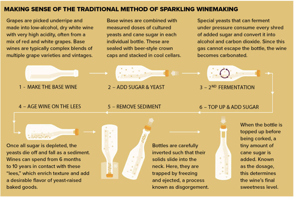 All wines sparkle at some point in their production because carbon dioxide is a byproduct of fermenting sugar into alcohol. However, sparkling wine as we know it was an innovation of the 19th century that was pioneered in the Champagne region of France, just north of Burgundy. The key to their success was to subject a base wine made from underripe grapes to a second fermentation in a technique that was once known as the Champagne Method, but is now formally called the Traditional Method.
